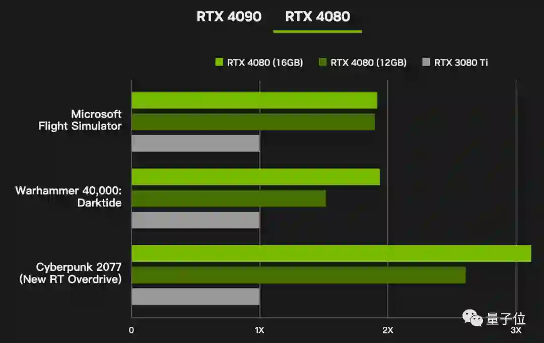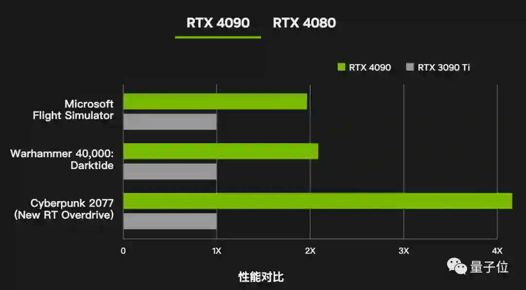 三款游戏帧数测试,在4K分辨率、全高设置、开启光追与DLSS情况下,4090提高到上代旗舰3090Ti的2-4倍,4080与3080Ti对比也提高到原来的2-3倍。