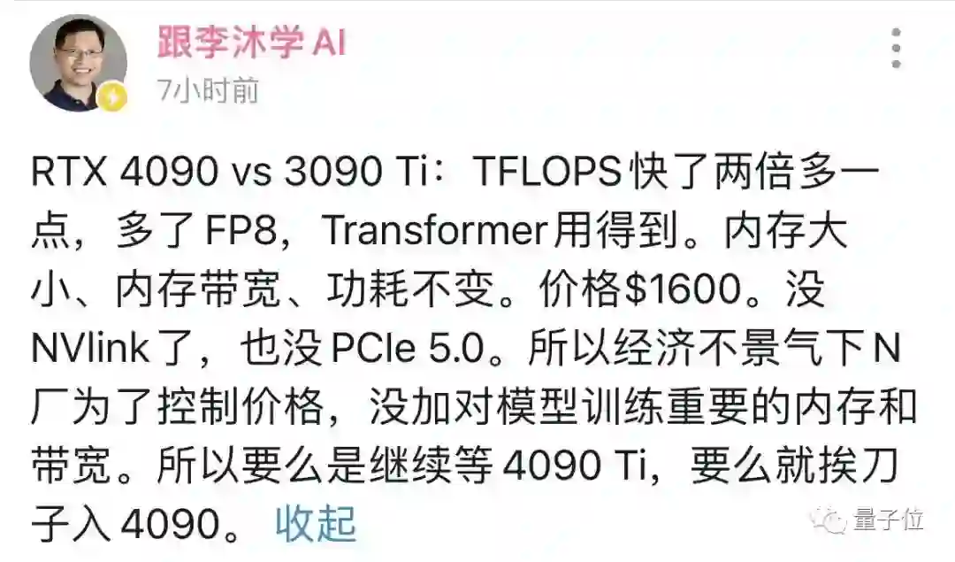 4090相比3090Ti,AI训练来说重要的参数都没增强,增强多卡并行的NVlink还给砍了,不如再等等4090Ti。