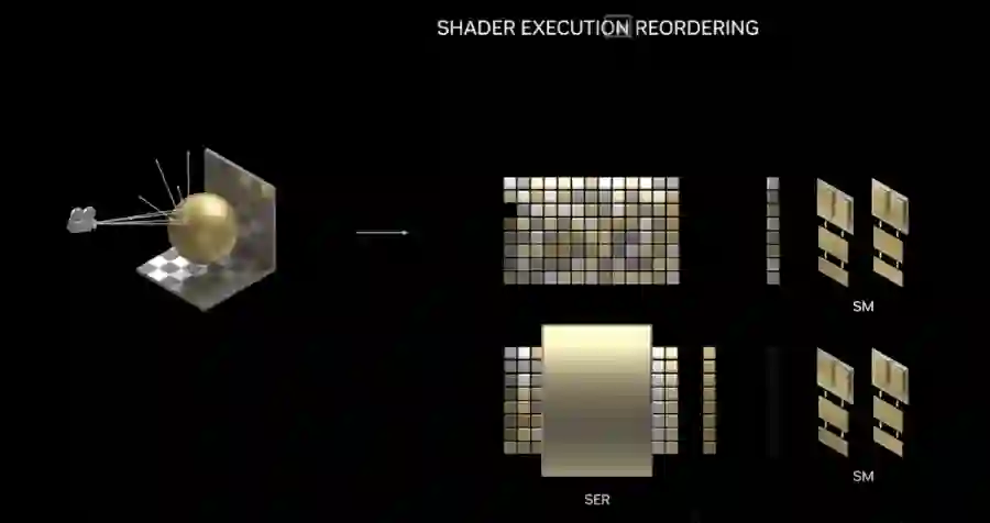 SM多单元流处理器方面,最大的更新是“Shader执行重排列”技术(Shader Execution Reordering)。