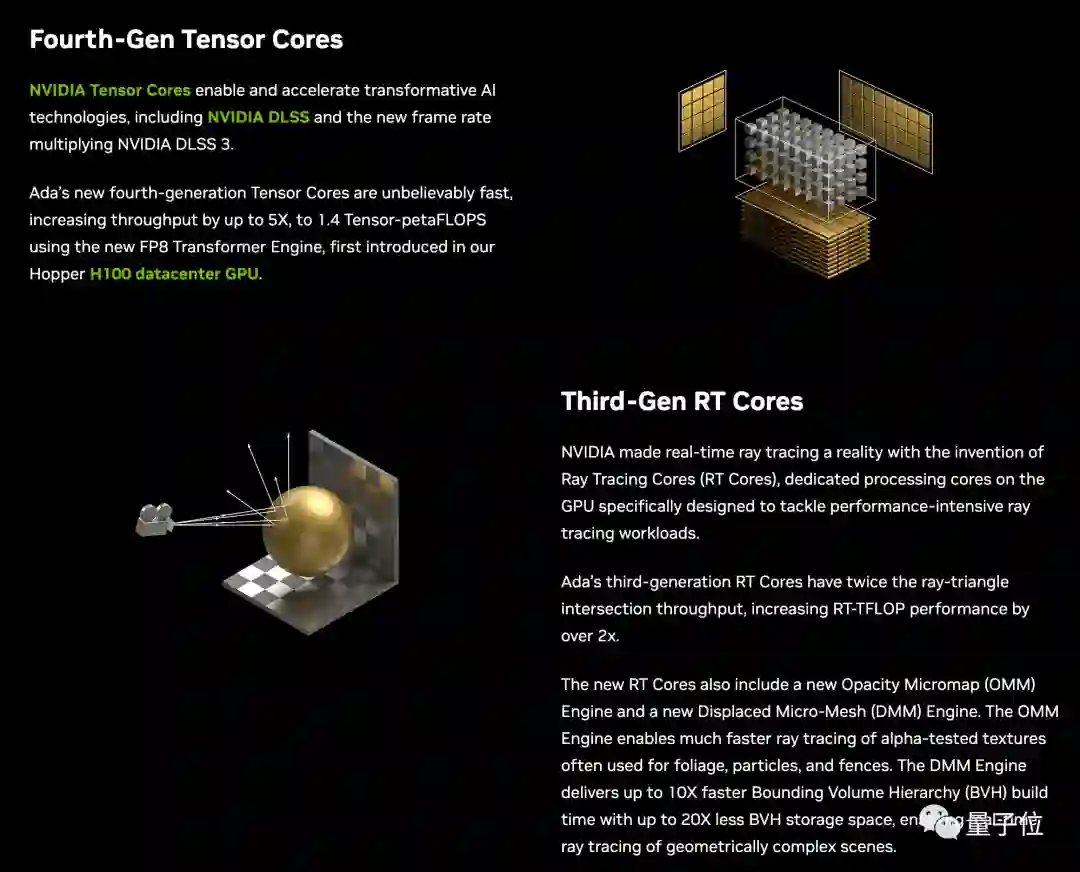 张量核心Tensor Core,用了数据中心GPU H100的同款,新增FP8精度数据格式支持,吞吐量增加5倍。