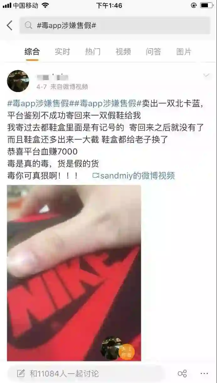 甚至还有卖家质疑“毒APP”将真鞋调包、寄回假鞋。某网友发微博称:“卖出一双北卡蓝,平台鉴别不成功寄回来一双假鞋给我,我寄过去的鞋盒里面是有记号的,寄回来之后就没有了,鞋盒还多出来一大截,恭喜平台血赚7000……”