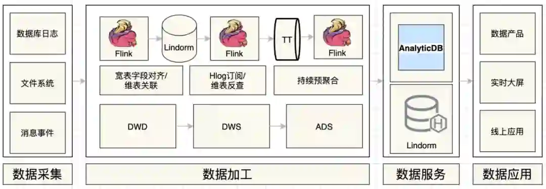数据模型及任务加工分层:在DWD层按照主题将不同数据源数据整合,并且输出到Lindorm,然后通过Hlog订阅,触发流任务反查事实表,将宽表字段对齐输出到TT,做为DWD中间层存储。构建可复用的DWS层,将常用维度及指标按照主题建模,供下游复用,减少烟囱化。