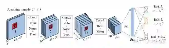如下图网络结构所示,整体网络有三个卷积层,维度为80的FC后面接k-1个二分类FC。
