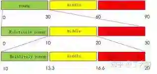 若每个区间的宽度都是固定的,那么只能处理离散的年龄,第三层级的“分辨率”只能是3.3,而且把年龄分段计算,会有明显边界效应。