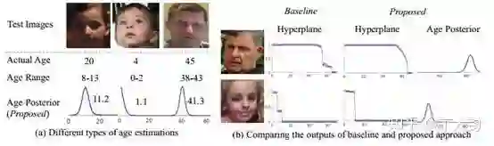 在上图的左图中作者对比了对年龄进行标记的不同方法,分别为直接标记真实年龄、标记一个范围、还有就是本文提出的使用概率分布表示。