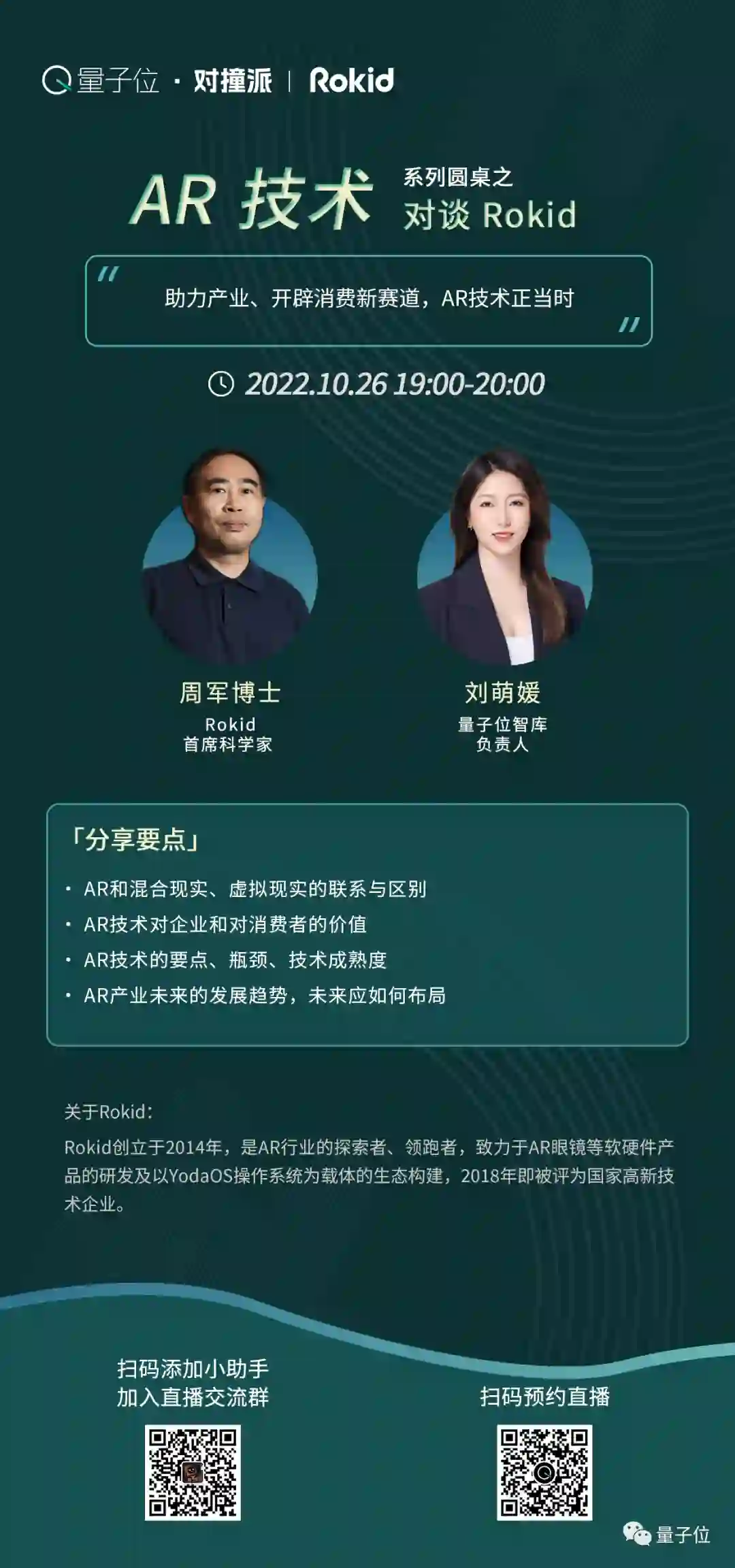 10月26日晚19:00,“AR/MR技术”系列对谈节目第1期「量子位·对撞派」邀请到了AR技术领域的先行者——Rokid,将由Rokid的首席科学家周军博士为我们分享~