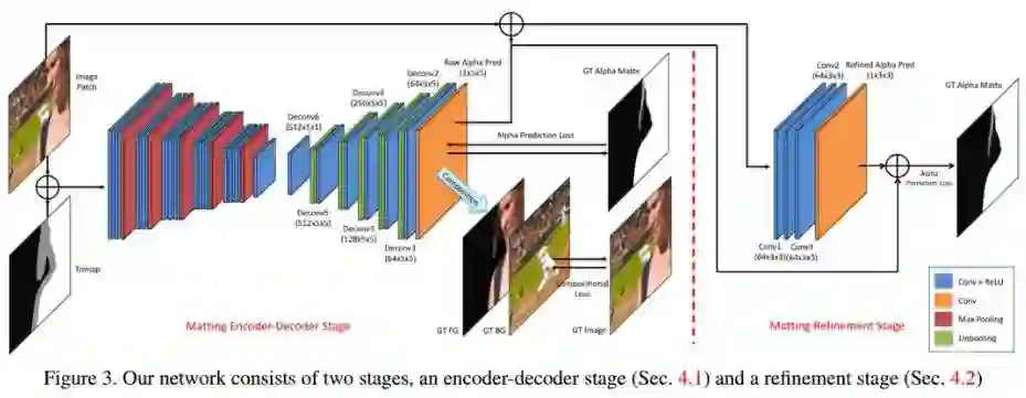 我们通过深度学习解决抠图问题。给定一个新的数据集(大规模抠图数据集),我们的神经网络能充分利用这些数据进行训练。并且该神经网络由以下两个阶段组成。