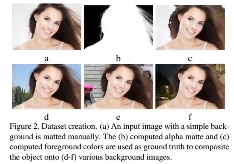 为了训练我们的深度神经网络,如下图所示,我们将识别目标(前景)抠取出来,并放入不同的背景而构建一个大型抠图数据集。