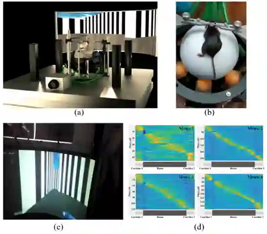 (a)虚拟场景中的行为训练; (b)悬浮球上训练的小老鼠; (c) 虚拟视觉空间;(d) 4只小老鼠海马CA1细胞放电模式