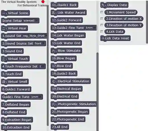 中控单元利用可视化编程界面,采用拖拽、组合的方式设计程序。同时开发了自定义积木,将所有功能指令转换成执行组件,如下图所示。自定义积木清晰明了地表示虚拟空间的所有指令,使无任何计算机开发基础的实验者也可以根据实验要求自主灵活地搭建和配置实验程序,设计复杂、灵活的小动物行为训练方案。操作简单明了,且方便进行延展和优化,从而满足不同的实验要求及环境。