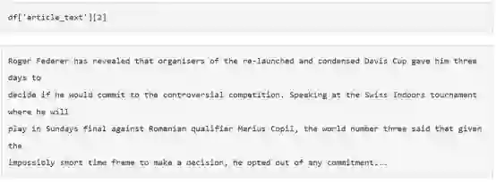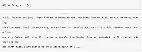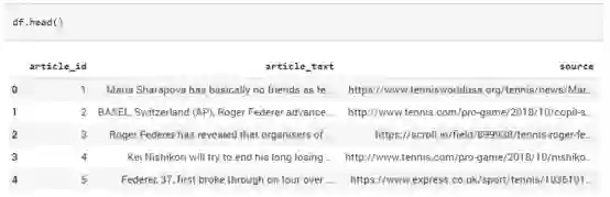 数据集有三列,分别是‘article_id’,‘article_text’,和‘source’。我们对‘article_text’列的内容最感兴趣,因为它包含了文章的文本内容。让我们打印一些这个列里的变量的值,具体看看它们是什么样。