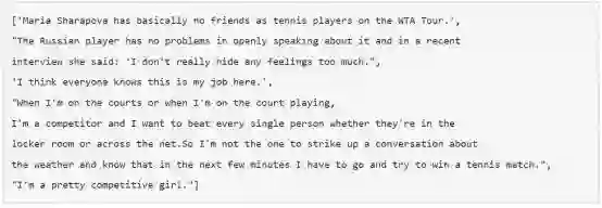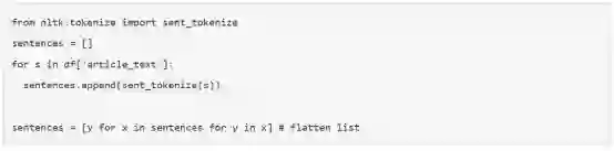 下一步就是把文章的文本内容分割成单个的句子。我们将使用nltk库中的sent_tokenize( )函数来实现。