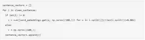 我们将在GloVe词向量的帮助下用clean_sentences(程序中用来保存句子的列表变量)来为我们的数据集生成特征向量。