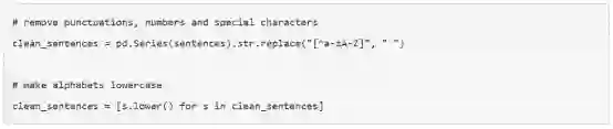 尽可能减少文本数据的噪声是一个好习惯,所以我们做一些基本的文本清洗(包括移除标点符号、数字、特殊字符,统一成小写字母)。