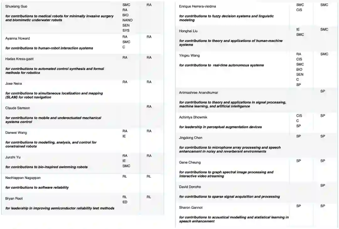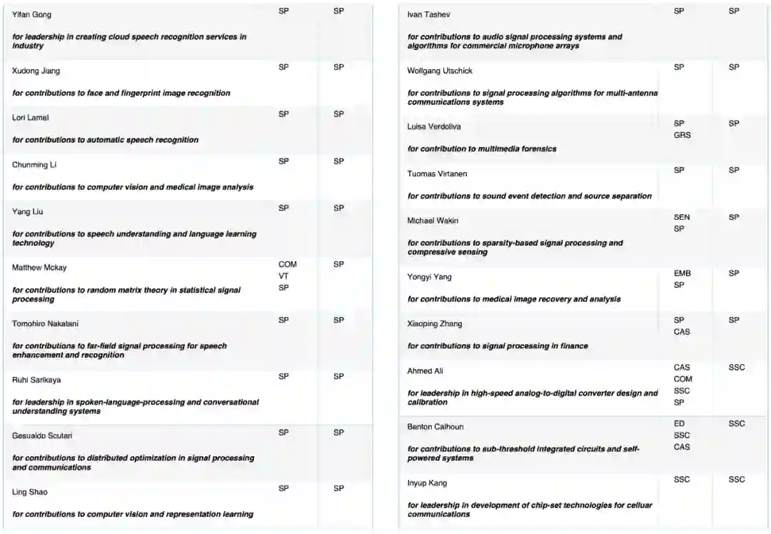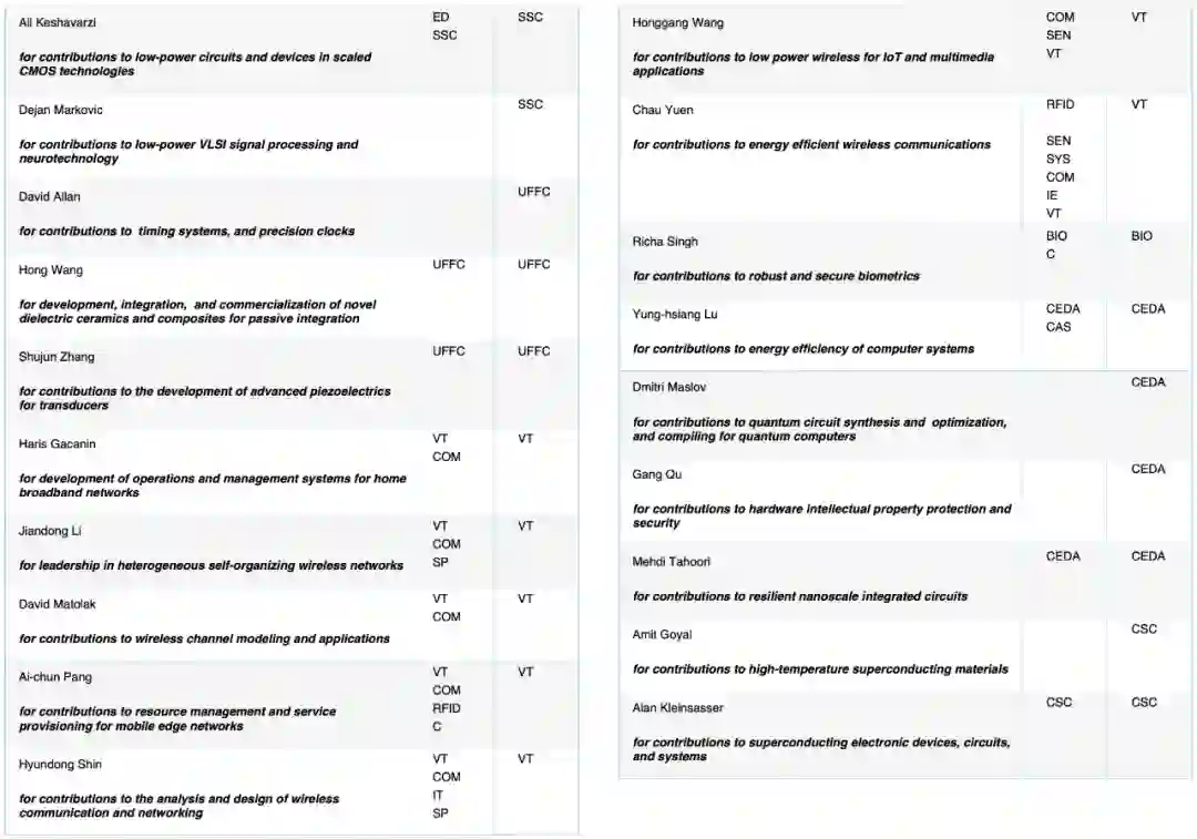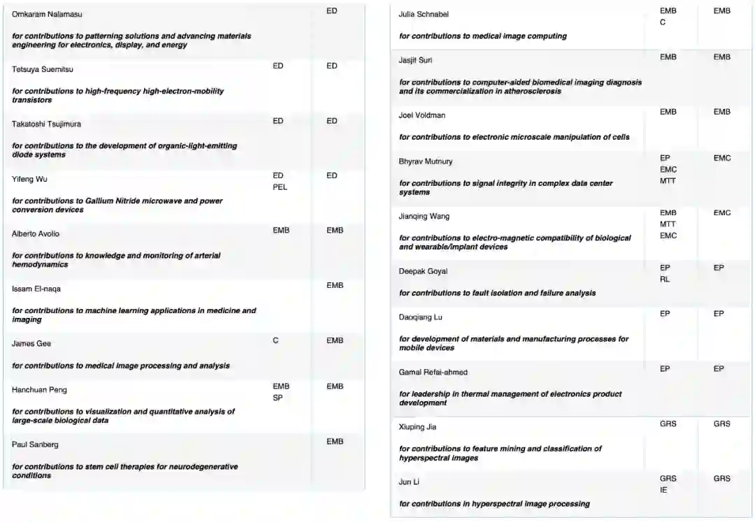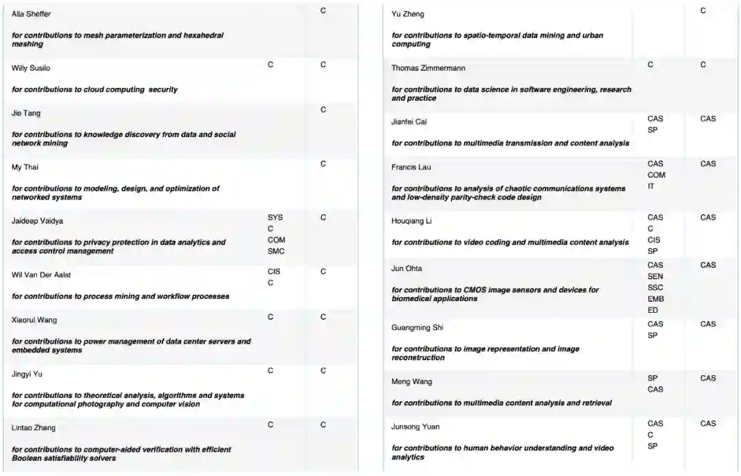 IEEE 的全称是 Institute of Electrical and Electronics Engineers(国际电气与电子工程师协会),是一个国际性电子技术与信息科学工程师的协会,如今在全球 160 多个国家和地区中拥有近 42 万会员。IEEE 建会于 1963 年 1 月 1 日,总部位于美国纽约市,是当今世界电子、电气、计算机、通信、自动化工程技术研究领域最著名、规模最大的非营利性跨国学术组织。在电气及电子工程、计算机及控制技术领域中,IEEE发表的文献占了全球将近 1/3。IEEE Fellow 即 IEEE 会士/院士,为协会最高等级会员,是该组织授予的最高荣誉,在学术科技界被认定为权威的荣誉和重要的职业成就,每年由同行专家在做出突出贡献的会员中评选出,当选人数不超过 IEEE 会员总人数的 0.1%。由于每年当选的 IEEE Fellow 数量较少,当选科学家基本都是在科学与工程技术领域内取得重要成就的杰出科学家。此次入选 IEEE Fellow 2021 名单的华人有:Jie Tang(唐杰)、Yi Huang(黄漪)、Guangming Shi(石光明)、Jingdong Chen(陈景东)、Hongke Zhang(张宏科)、Houqiang Li(李厚强)、Jianfei Cai(蔡剑飞)、Meng Wang(汪萌)、Jingyi Yu(虞晶怡)、Yu Zheng(郑宇)、Chunjiang Qian(钱春江)、Jiandong Li(李建东),Jun Li(李军),Xiuping Jia(贾秀萍),Huadong Ma(马华东),Huang De Shuang(黄德双)、Xiaofeng Liao(廖晓峰)、Bao-liang Lu(吕宝粮)、Jianhui Wang(王剑辉)、Junzhi Yu(喻俊志)、Dong Yue(岳东)、Shixia Liu(刘世霞)、Zhaocheng Wang(王昭诚)、Xiaoping Zhang(张晓平)、Wenchuan Wu(吴文传)、Zhongdong Wang(王忠东)、Jizhong Zhu(朱继忠)、Fushuan Wen(文福拴),Cong Wang(王聪)等。(学术头条注:由于 IEEE 历年新增 Fellow 名单只有英文名和入选原因,而没有详细的工作单位、职务和履历介绍,所以难免出现统计不全和错误,如有发现,欢迎补充指正。) 以下是学术头条(ID:SciTouTiao)统计的 75 位入选华人学者名单以及 IEEE 官方给出的入选理由,完整名单如下: 1、唐杰,清华大学计算机系教授、系副主任,获杰青、IEEE Fellow。研究人工智能、认知图谱、数据挖掘、社交网络和机器学习。发表论文300余篇,引用16000余次,获ACM SIGKDD Test-of-Time Award(十年最佳论文)。主持研发了研究者社会网络挖掘系统AMiner,吸引全球220个国家/地区2000多万用户。担任IEEE T. on Big Data、AI OPEN主编以及WWW’21、CIKM’16、WSDM’15的PC Chair。获北京市科技进步一等奖、人工智能学会一等奖、KDD杰出贡献奖。 入选理由:在从数据和社会网络挖掘中发现知识方向做出贡献(for contributions to knowledge discovery from data and social network mining)。2、黄漪(Yi Huang)入选理由:在硅整流二极管天线技术方向做出贡献(for contributions to rectenna technology)3、Hanyang Wang入选理由:在移动终端天线方向做出贡献(for contributions to mobile terminal antennas)4、Geyi Wen入选理由:在天线品质因数方向做出贡献(for contributions to antenna quality factor)5、Zhinong Ying入选理由:在移动终端天线技术方向做出贡献(for contributions to mobile terminal antenna technology)6、Ninghui Li入选理由:在数据隐私和安全方向做出贡献(for contributions to data privacy and security)7、刘世霞(Shixia Liu)入选理由:在可视化文本分析和可视化模型分析方向做出贡献(for contributions to visual text analysis and visual model analysis)8、Le Lu入选理由:在用于癌症检测和诊断的机器学习方向做出贡献(for contributions to machine learning for cancer detection and diagnosis)9、Xiaorui Wang入选理由:在数据中心服务器和嵌入式系统的电源管理方向做出贡献(for contributions to power management of data center servers and embedded systems)10、虞晶怡(Jingyi Yu)入选理由:在计算机摄影和计算机视觉的理论分析、算法和系统方向做出贡献(or contributions to theoretical analysis, algorithms and systems for computational photography and computer vision)11、Lintao Zhang入选理由:在具有高效布尔可满足性求解器的计算机辅助验证方向做出贡献(for contributions to computer-aided verification with efficient Boolean satisfiability solvers)12、郑宇(Yu Zheng)入选理由:在时空数据挖掘与城市计算方向做出贡献(for contributions to spatio-temporal data mining and urban computing)13、蔡剑飞(Jianfei Cai)入选理由:在多媒体传输与内容分析方向做出贡献(for contributions to multimedia transmission and content analysis)14、李厚强(Houqiang Li)入选理由:在视频编码和多媒体内容分析方向做出贡献(for contributions to video coding and multimedia content analysis)15、石光明(Guangming Shi)入选理由:在图像表示和图像重建方向做出贡献(for contributions to image representation and image reconstruction)16、汪萌(Meng Wang)入选理由:在多媒体内容分析与检索方向做出贡献(for contributions to multimedia content analysis and retrieval)17、Junsong Yuan入选理由:在人类行为理解和视频分析方向做出贡献(for contributions to human behavior understanding and video analytics)18、黄德双(Huang De Shuang)入选理由:在模式识别和生物信息学的神经网络方向做出贡献(for contributions to neural networks for pattern recognition and bioinformatics)19、廖晓峰(Xiaofeng Liao)入选理由:在神经动力学系统和混沌密码学方向做出贡献(for contributions to neurodynamic systems and chaotic cryptography)20、吕宝粮(Bao-liang Lu)入选理由:在人工神经网络和脑机接口方向做出贡献(for contributions to artificial neural networks and affective brain- computer interfaces)21、Min Chen入选理由:在数据驱动的通信、缓存和计算方向做出贡献(for contributions to data-driven communication, caching, and computin
