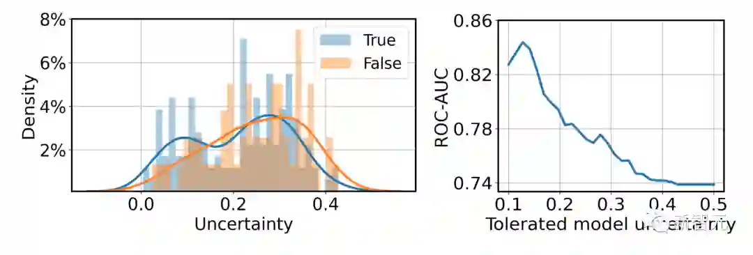 错误的预测通常会产生更高的不确定性(参加左上图),因此能够利用经验不确定性阈值来建议用户在手机上重复音频测试或在数字诊断仍然失败时进行额外的临床测试(参见右上图)。通过将不确定性纳入自动诊断系统,可以实现更好的风险管理和更稳健的决策。