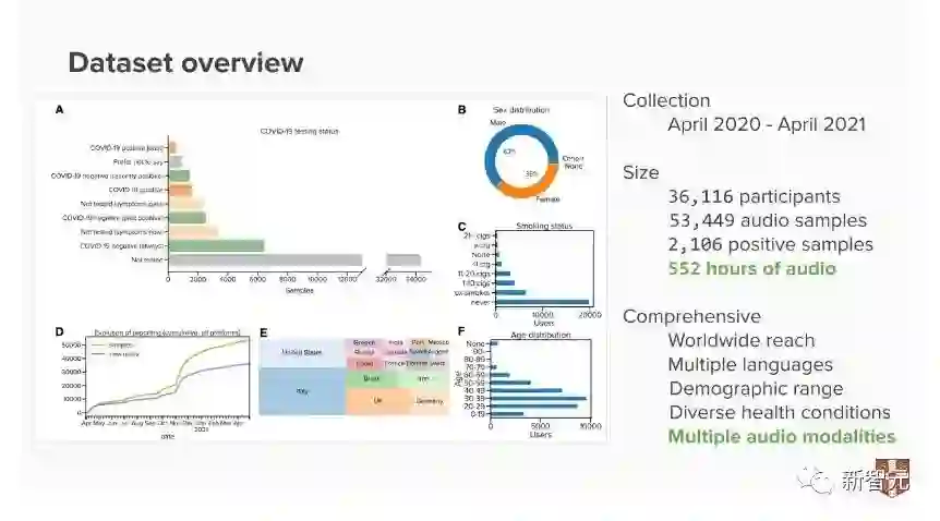 2021年11月,研究人员在NeurIPS 2021中发布了全面的大规模COVID-19音频数据集,由36,116 名参与者众包的53,449个音频样本(总共超过552小时)组成。相关论文已被NeurIPS 2021 Dataset Track接受发表。