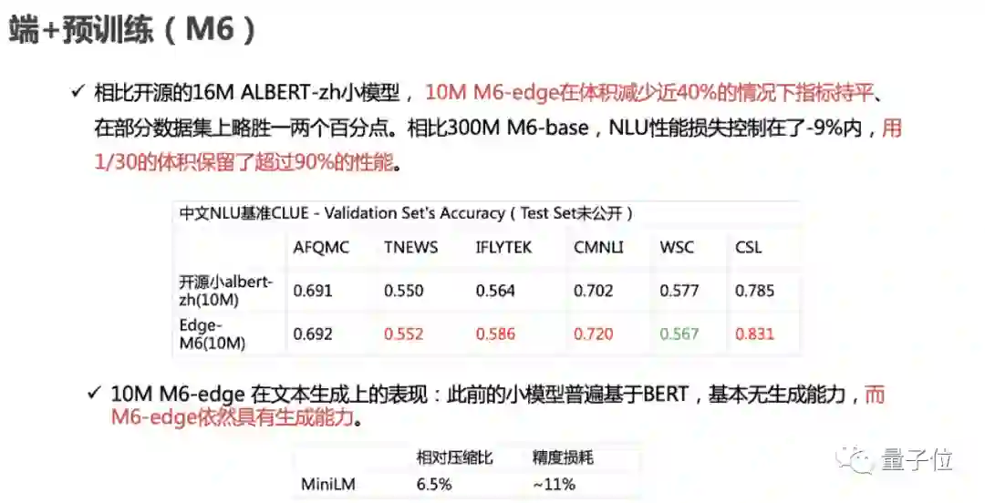 具体而言,压缩后的M6小模型大小仅为10MB,与开源的16M ALBERT-zh小模型相比,体积减少近40%,并且效果更优。难得的是,10MB的M6模型依然具有文本生成能力。