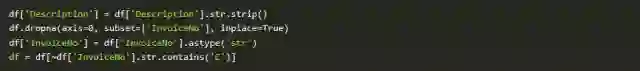 我们需要做一点数据处理。首先,一些数据描述中具有需要删除的空格。我们还会删除没有发票编号的行,并删除信用交易(发票编号包含C)。