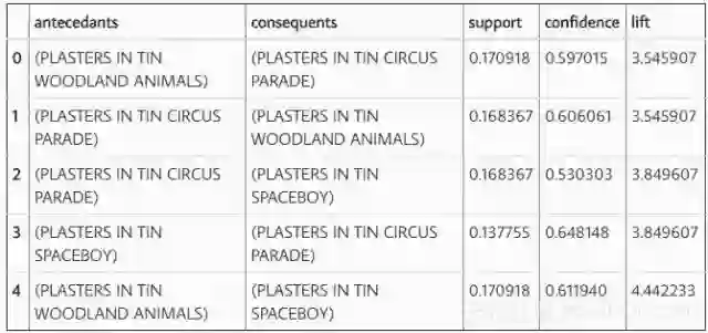 现在,最棘手的部分是弄清楚我们得到的这些结论告诉我们什么了。可能绝大多数程序猿不太关注。例如,我们可以发现很多关联规则具有很高的提升价值,这意味着它的发生频率可能会高于交易和产品组合数量的预期值。这部分分析是行业知识将派上用场的地方。由于我没有,所以我只是想找几个说明性的例子。