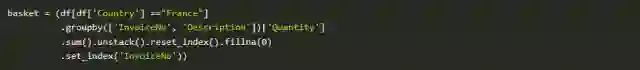 数据清理完成后,我们需要将每个产品进行one-hot编码。为了保持数据集小,我选择只是看法国的销售记录。然而,在下面的其他代码中,我将这些结果与德国的销售进行比较。进一步的国家比较将会是有趣的调查。