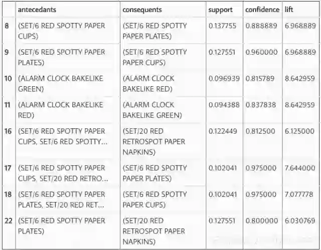 在查看规则时,可以发现似乎绿色和红色闹钟是一起购买的,红纸杯,餐巾纸和纸板是以总体概率提高的方式一起购买的。