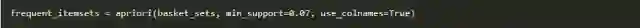 既然数据的结构是正确,我们可以生成支持至少7%的频繁项目集(选择这个数字,可以帮助我得到更多有用的例子。)