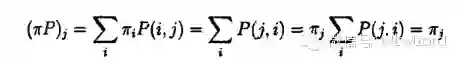 实际上,经过一个充分长的时间,期望的天气与初始状态无关,达到马氏链平衡状态,这儿的概率值与初始值是独立的。一个马氏链可能达到一个平稳分布,这儿作为某个特别给定状态的概率向量是与初始值无关的,平稳分布就是满足下式的分布: