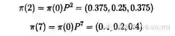 如果假设今天是雨,即π(0) = (1,0,0),则有π(2) = (0.4375,0.1875,0.75)和π(0) = (0.4,0.2,0.4)