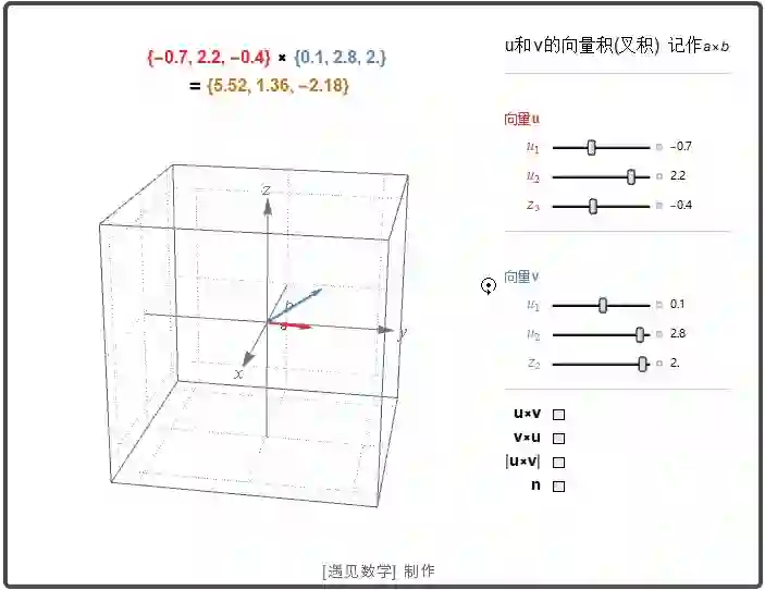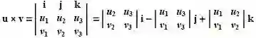 空间两个非零向量 u 和 v. 如果 u 和 v 不平行, 那么就确定了一个平面. 这样可以用右手法则选择一个垂直于这个平面的单位向量 n. |u×v| 是平行四边形的面积.