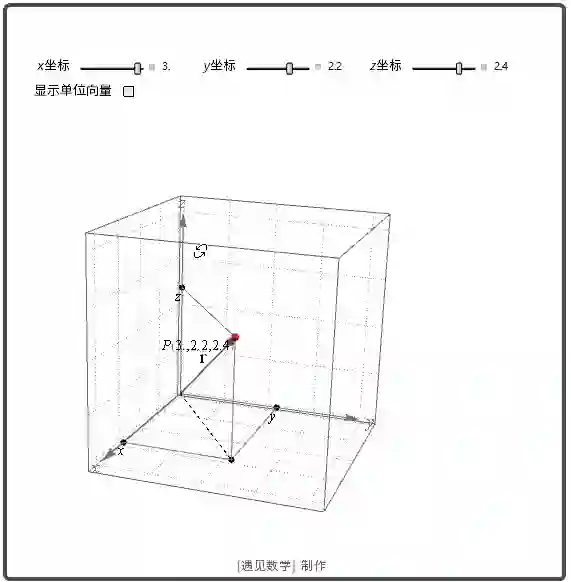 空间的点 P 的笛卡尔坐标 (x,y,z) 可用其位置向量表示. 如下图所示. 笛卡尔坐标也是直角坐标, 因为定义这种坐标的轴以直角相交.