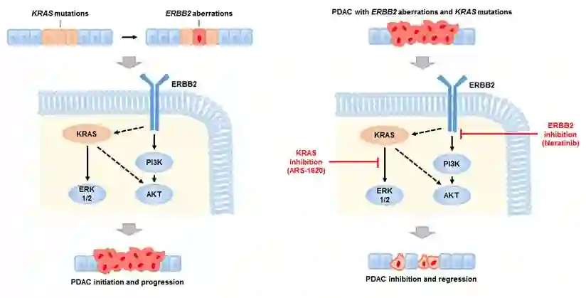 博士研究生李张在研究员王跃祥的指导下,系统分析了PDAC基因组测序数据,发现约8.5%的PDAC含有ERBB2的基因组变化,包括基因突变和基因扩增。ERBB2基因改变频率位于100个酪氨酸激酶基因的首位。有趣的是,含有ERBB2基因改变的PDAC同时含有KRAS突变,并且ERBB2基因改变与PDAC病人的不良预后相关。研究团队利用一系列体外、体内PDAC模型证明了PDAC中ERBB2基因改变具有致癌性,加速了PDAC恶性进展,降低了癌细胞对KRAS的依赖性。研究团队利用人源肿瘤异种移植小鼠模型,证明联合应用ERBB2抑制剂和KRAS抑制剂显著抑制人源PDAC的生长,为靶向ERBB2的药物用于胰腺癌病人的治疗提供了实验依据。