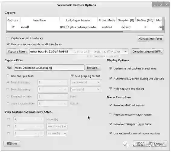 (3)在该界面设置仅捕获AP(Test)的包,其Mac地址为8c:21:0a:44:09:f8。设置完以上信息后,单击Start按钮,将开始捕获数据包,如图13所示。