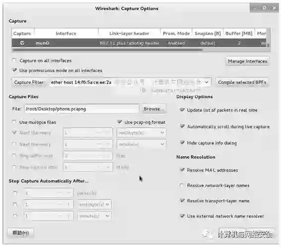 下面以Mac地址为14:f6:5a:ce:ee:2a的手机客户端为例,查看是否有流量产生。这里首先捕获该客户端的数据包,为了避免捕获到太多无用的数据包,使用捕获过滤器指定仅捕获Mac地址为14:f6:5a:ce:ee:2a客户端的数据包,如图20所示。