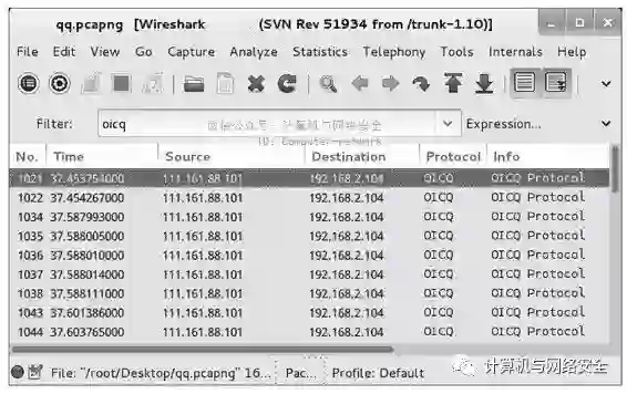 该界面显示了qq.pcapng捕获文件。由于QQ通信使用的是OICQ协议,可以使用OICQ显示过滤器来过滤器所有的OICQ包。qq.pcapng捕获文件过滤后,显示结果如图16所示。