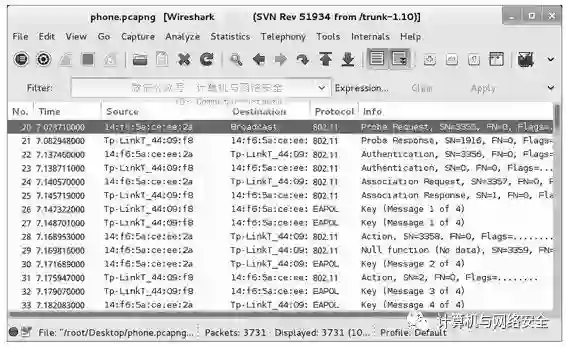 为了更清楚地理解客户端接入AP的过程,这里捕获了一个名为Probe.pcapng的捕获文件。在捕获文件中捕获到一个客户端连接AP的过程,其接入过程如图9所示。