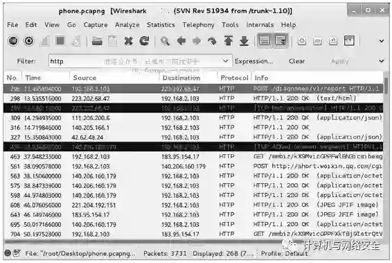 在该界面显示了客户端连接到WiFi网络的相关数据包。通常人们在手机上安装的一些使用流量的软件有QQ、微信和播放器等。这些软件都是应用类的软件,如果启动的话,会连接对应的服务器。这时候可以使用http显示过滤器,过滤并分析相关的包,如图23所示。