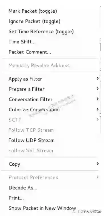 前面提到QQ传输的数据都是加密的,这里来确认下是否真的是加密的。如查看qq.pcapng捕获文件中的一个QQ会话内容。在图16中选择第一个包(1021帧),然后单击右键,将弹出如图18所示的界面。