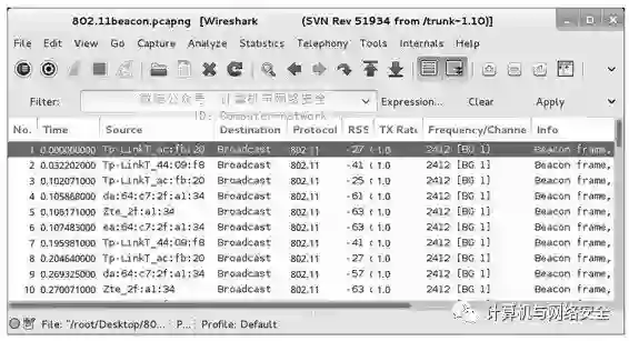 捕获一个名为802.11beacon.pcapng的包,在该包中包括当前无线网卡搜索到的无线数据包,其内容如图1所示。