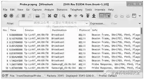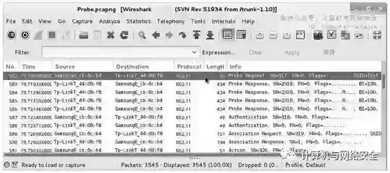 下面以Probe.pcapng捕获文件为例,查看客户端与AP的连接。Probe.pcapng捕获文件如图10所示。