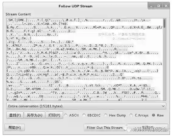 在该菜单栏中选择Follow UDP Stream命令,将显示如图19所示的界面。