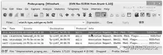 图10中显示了Probe.pcapng捕获文件中所有的包。接下来使用显示过滤器wlan.fc.type_subtype eq 0x00,过滤所有的Association Request包,显示界面如图11所示。