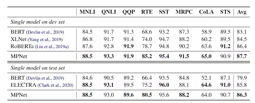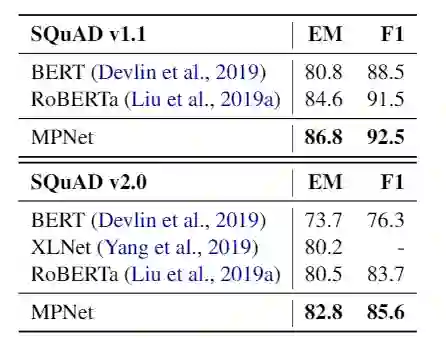从表5我们还能发现以下几个现象:1)PLM 相比 MLM 的确取得了不错的效果提升;2)PLM 没有完全解决 MLM 的问题,因为从表中可以看到直接在 MLM 中引入预测词之间的依赖(MLM + output dependency)比 PLM 的效果更好;3)PLM 在解决 MLM 的预测词之间依赖问题的同时,丢掉了 MLM 中的句子全局位置信息。因此,MPNet 通过吸收 MLM和 PLM 的优点,规避各自的问题,取得了更高的精度。相比先前的预训练模型 BERT、XLNet 以及 RoBERTa,在相同的模型配置下,MPNet 在对比的数据集上都取了显著的效果提升。