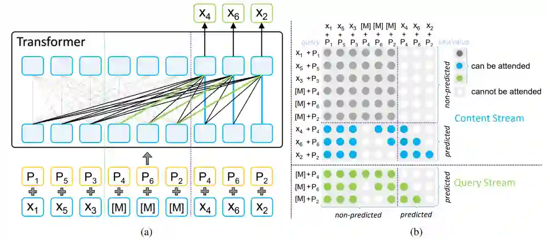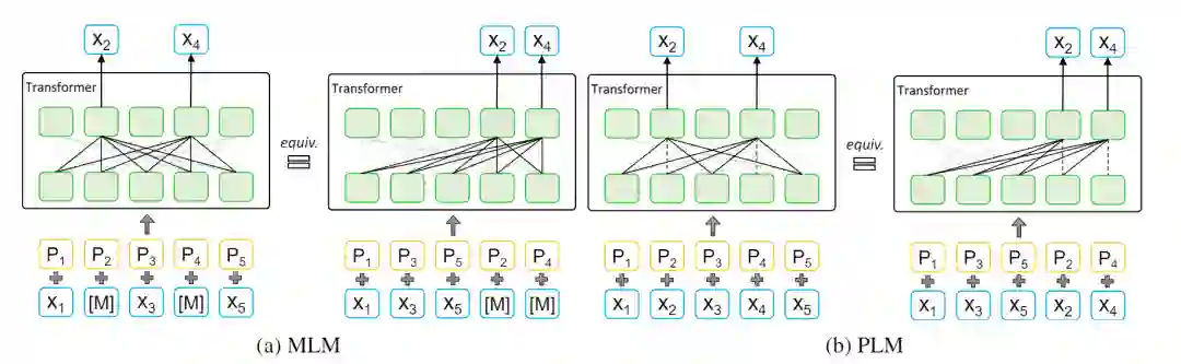 图1:(a) 掩码语言模型 MLM 和 (b) 排列语言模型PLM,(a) 和 (b) 右侧为 MLM 和 PLM 的统一视角。
