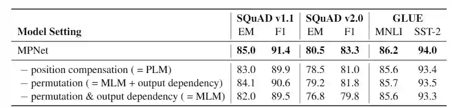 为了能够进一步分析 MPNet 在获取全局位置和建模预测单词之间的依赖关系,以及验证 MPNet 中每个模块设计的有效性,我们做了一系列消融实验来对比分析,如表5所示。我们发现在 MPNet 的基础上去掉位置补偿(position compensation),去掉预测部分的随机排列(permutation)以及进一步去掉预测词之间的依赖关系(output dependency),在 GLUE 和 SQuAD 任务上都会导致明显的模型精度损失,这也验证了 MPNet 在获取全局位置信息和建模预测词之间依赖上的有效性。