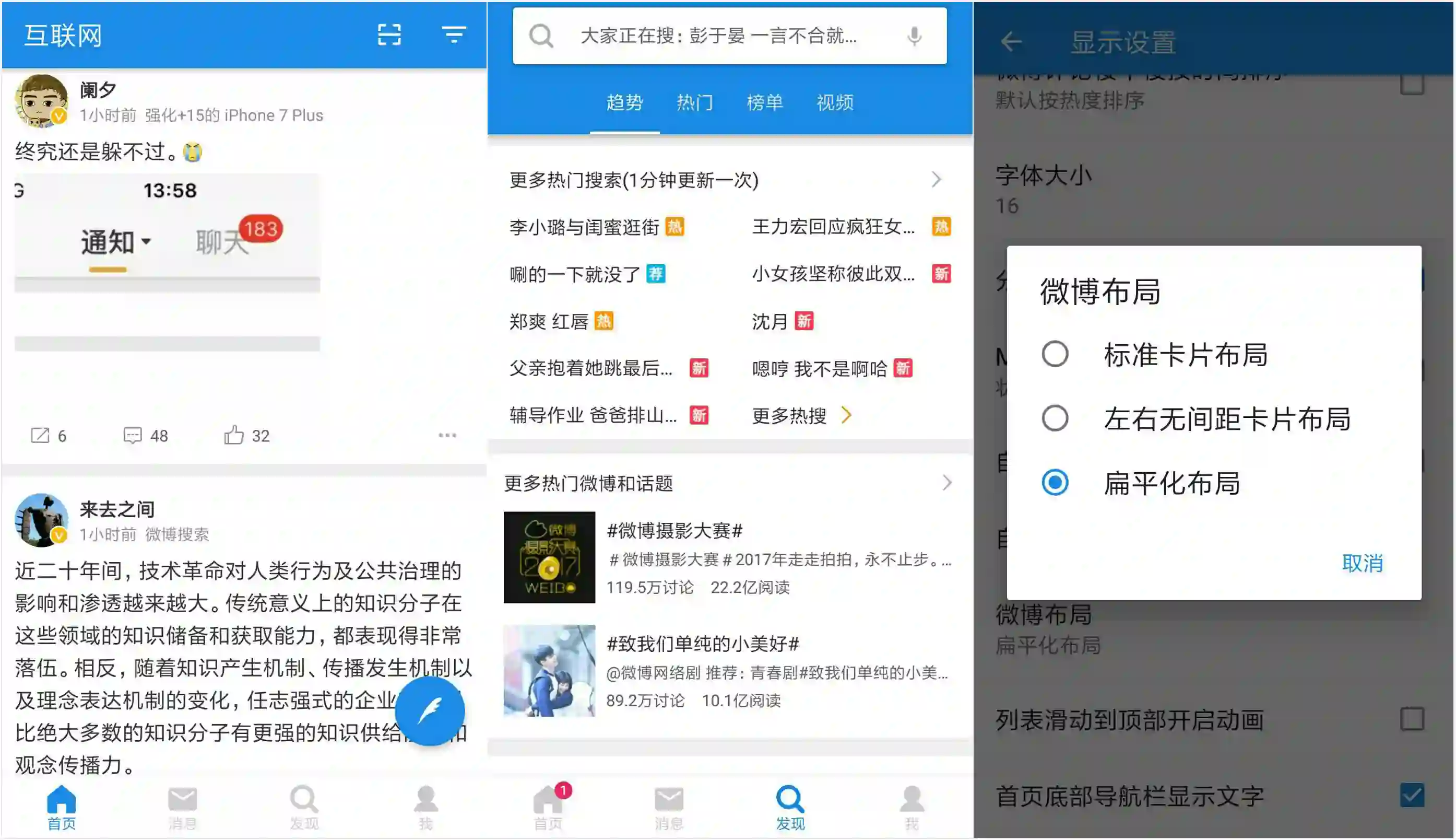 Share和Emore算新晋小鲜肉了。可更换纯色主题,滑动隐藏按键/全屏显示,这都是标准的安卓设计语言。不过我更推崇Emore,它有更多个性化设置。比如首页信息流展现方式,可选择卡片或扁平化布局。卡片布局美观但浪费空间,扁平化布局则相对紧凑。热门发现功能、悬浮按钮功能等,都可以自定义。