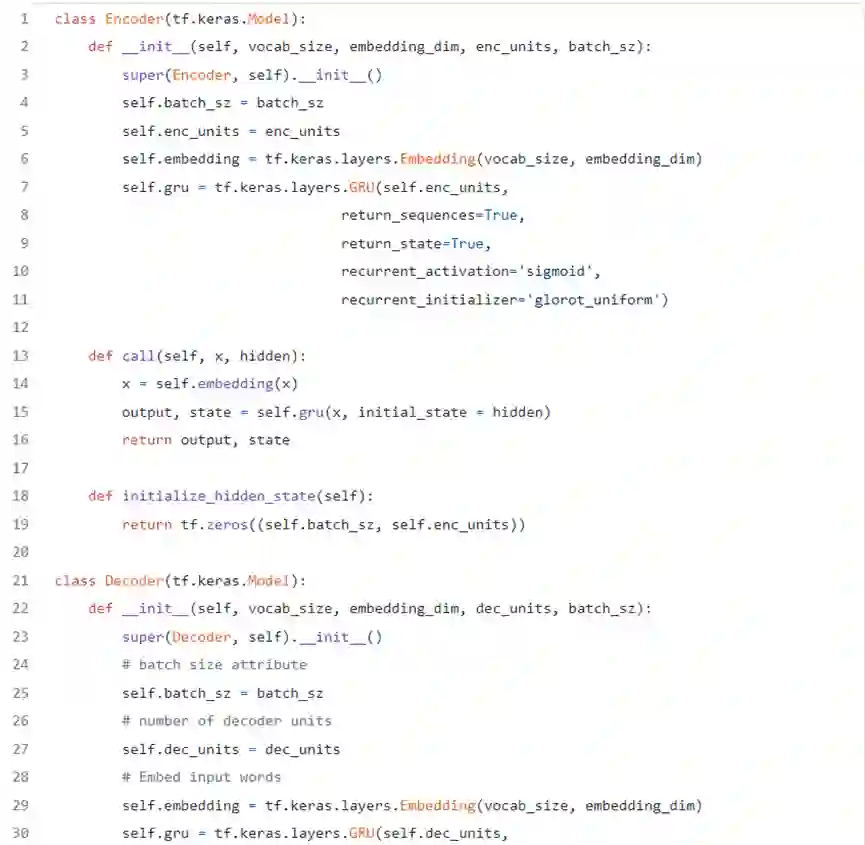 在下一节中,将Bahdanau注意力机制应用于序列任务,利用Keras实现一个编码器-解码器架构,可以从Google Colab Notebook.上下载该例子的完整代码。