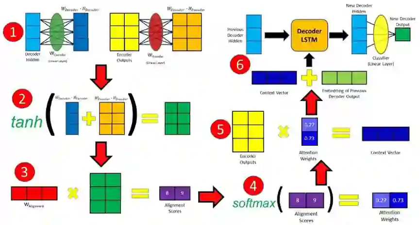 可以将Bahdanau注意力机制划分为以下步骤:首先,将上一个时间步长中的解码器隐含态与编码器隐含态(输入句子中的每个元素对应一个隐含态)相组合,生成对齐分值。类似于Vaswani注意力机制中的sqrt(d),Bahdanau注意力机制采用Tanh作为缩放因子,可以用下面的公式来表示: