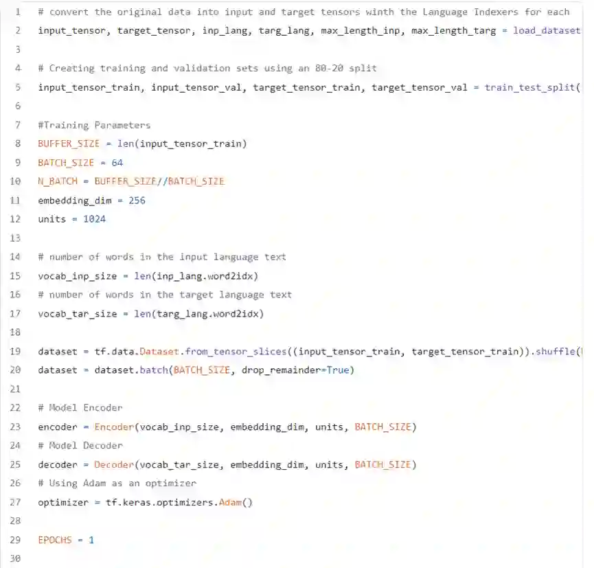 最后,序列到序列翻译模型的所有片段均准备好之后,只需运行以下代码段,实例化数据集并开始训练模型。