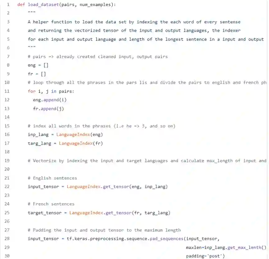 5. 把上述内容归集起来。清理输入数据、向量化输入和输出语言的张量、计算输入和输出句子的最大长度,并添加必要的填充。这些操作通过下述代码来实现。